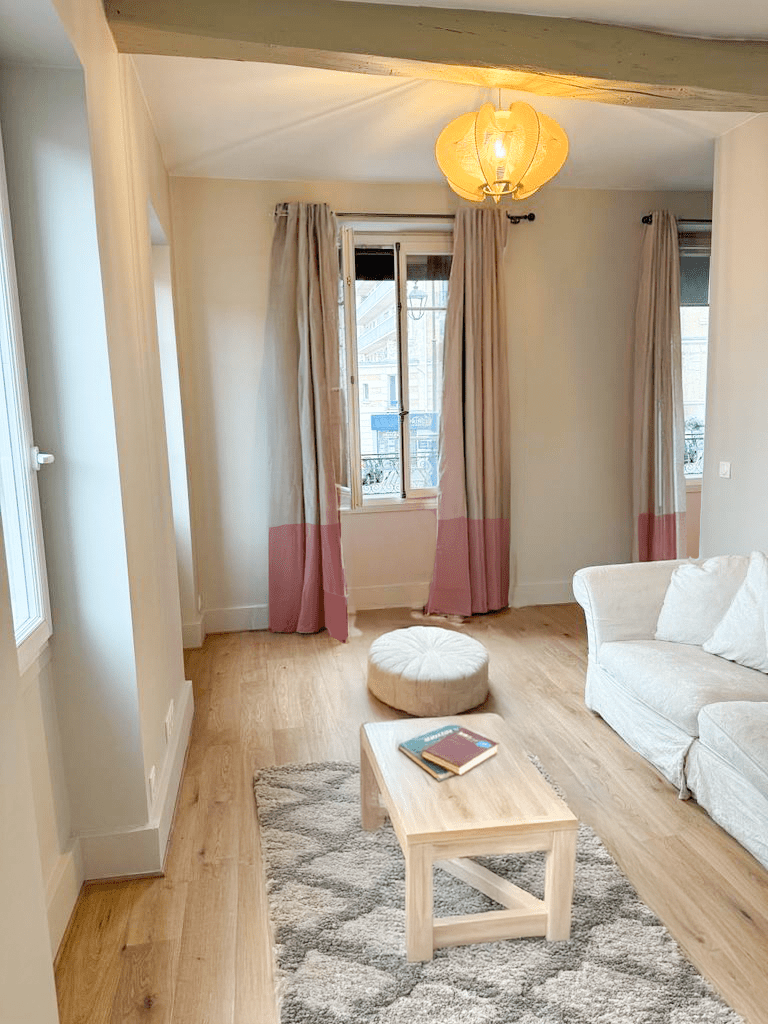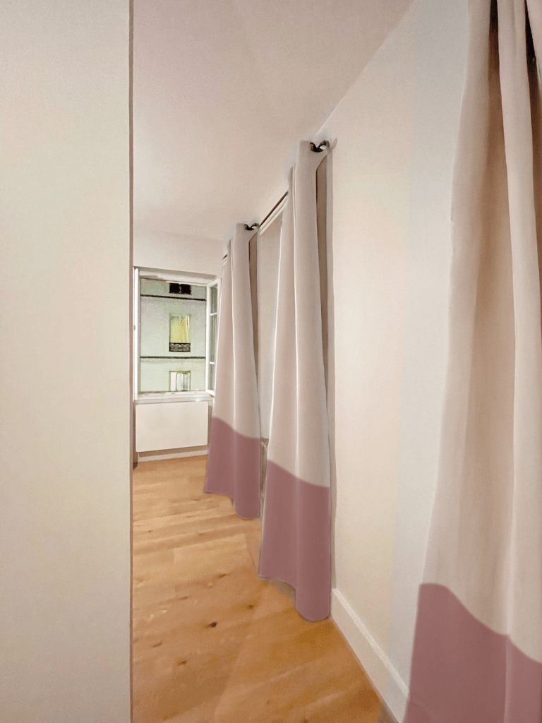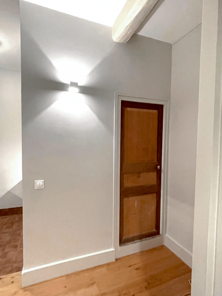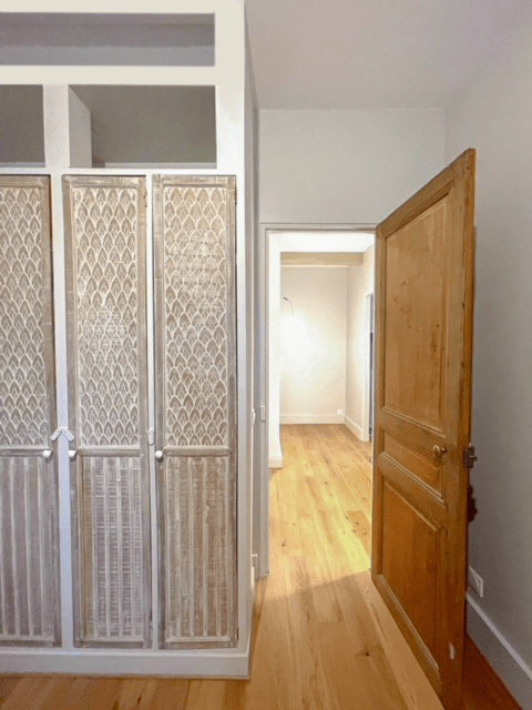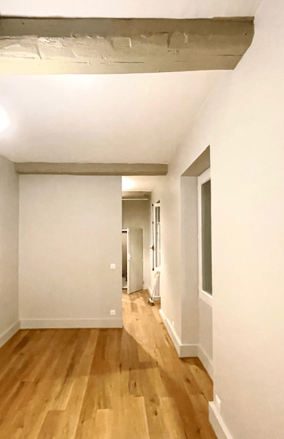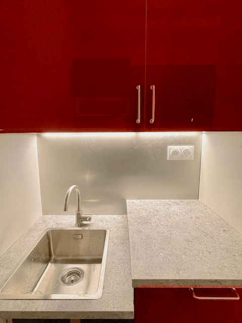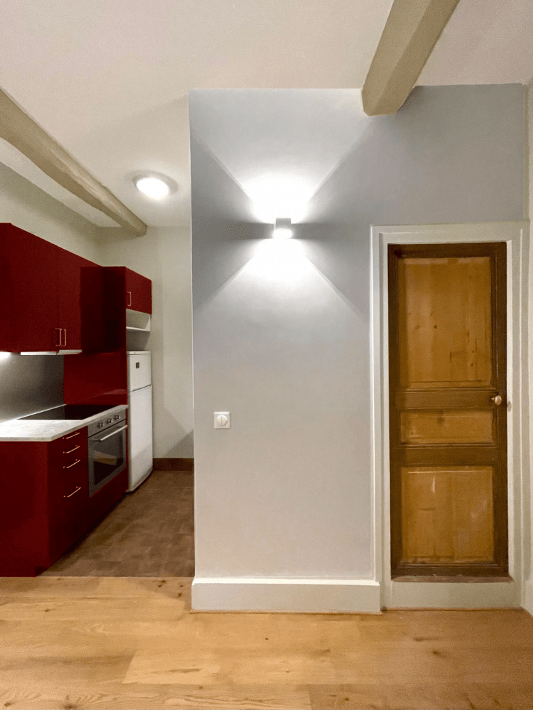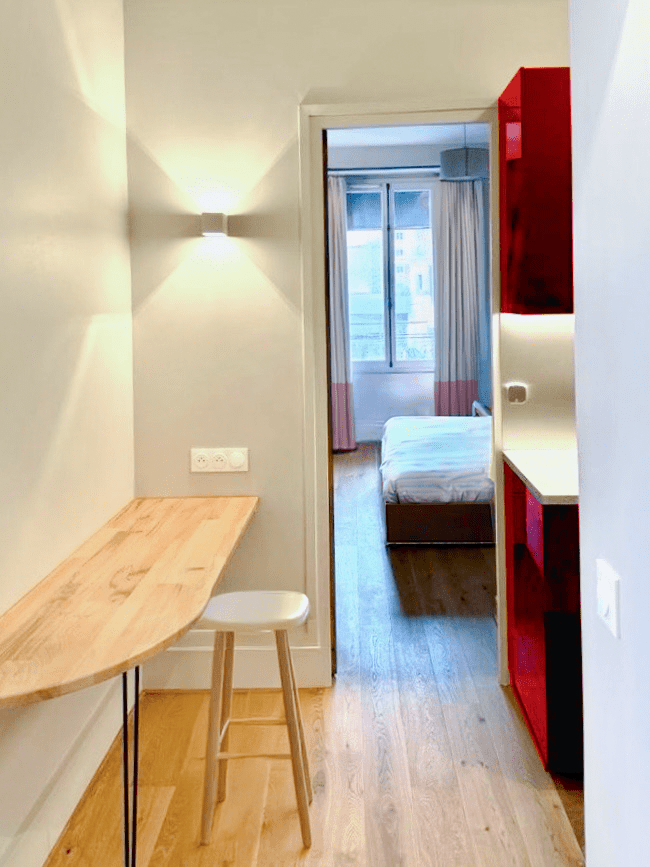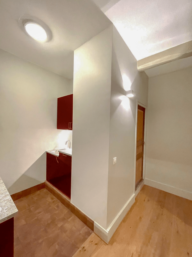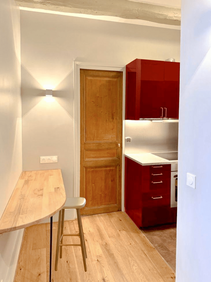 Projet : Transformation du dernier étage d’un triplex en un trois pièces optimisé. Le décloisonnement d’une partie de l’espace permet de redistribuer les volumes, créant une entrée ouverte sur une enfilade de fenêtres qui baigne la pièce principale de lumière. L’espace cuisine a été agrandi en empiétant sur la salle de bain, tandis que le recloisonnement a permis de définir un salon et une chambre. Création de la cuisine en lieu et place de la trémie de l’escalier. Malgré sa dimension XS, elle contient toutes les fonctions essentielles.