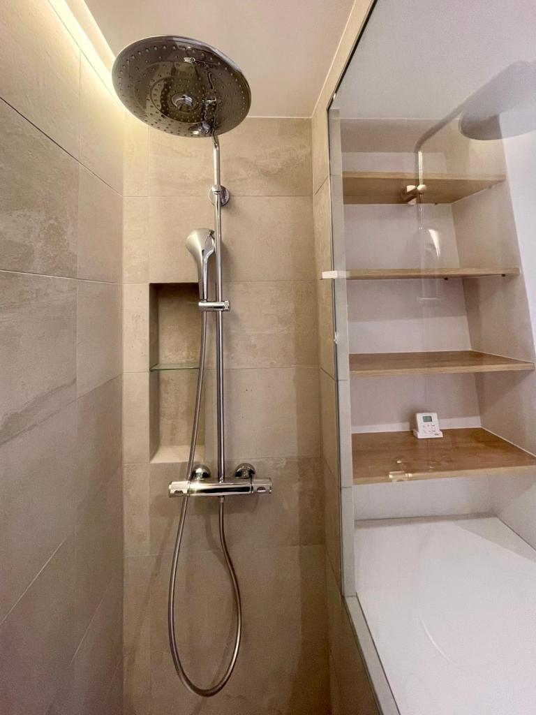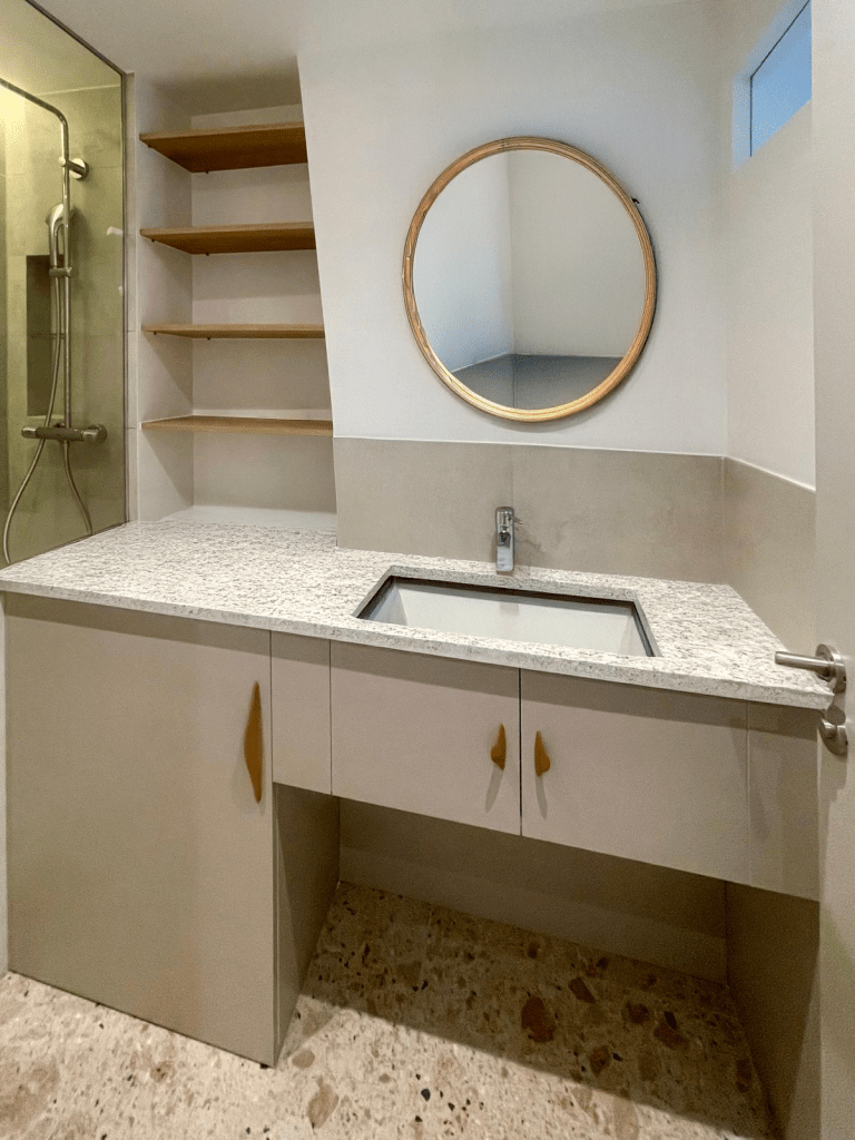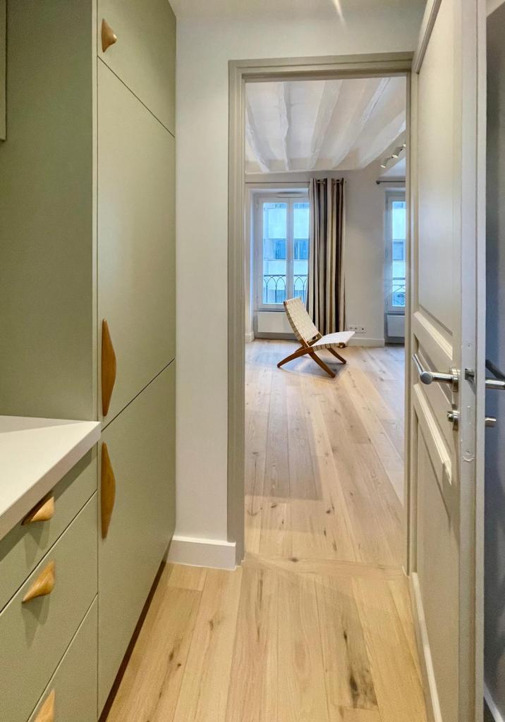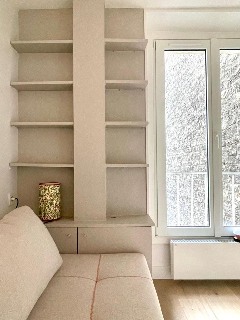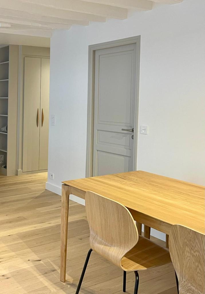 Projet : Ce projet revisite un appartement aux poutres apparentes, mettant en scène une enfilade de fenêtres grâce à la création de meurtrières, apportant luminosité et une impression d’espace. Cette intervention met en valeur l’alliance entre le charme historique des poutres et des aménagements contemporains.