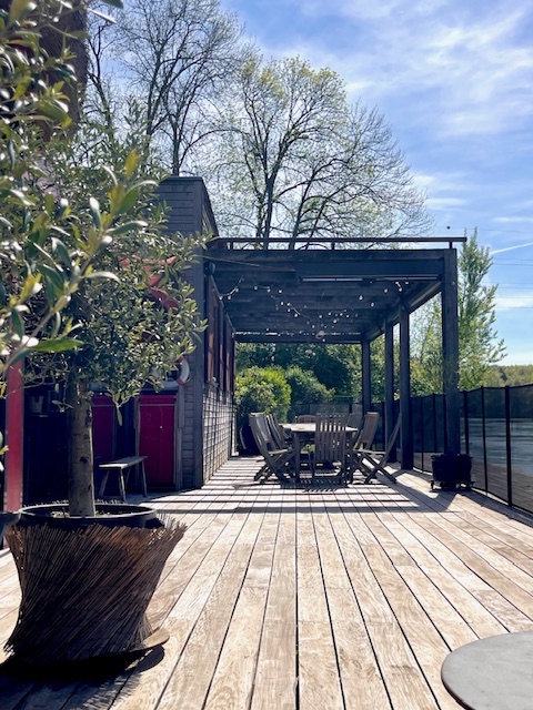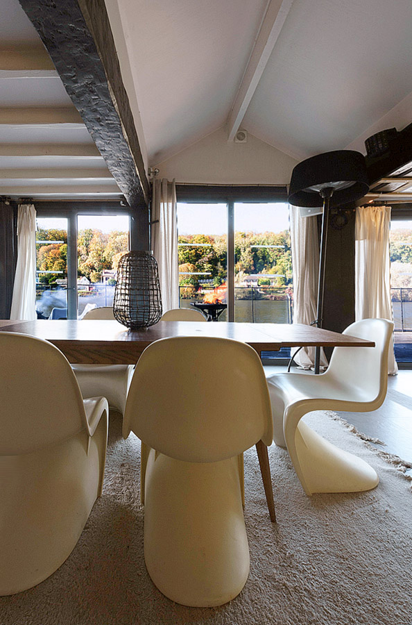 Projet : Tel un grand radeau amarré sur la Seine, Le Bord’O s’étire le long du fleuve. Aménagé comme un loft, ses 15 mètres linéaires de baies vitrées effacent la limite entre intérieur et extérieur. Le séjour se prolonge par une terrasse attenante de 150 m² avec une pergola en chêne agrémentée d’un store rétractable qui permet de profiter de l’extérieur par tous temps.