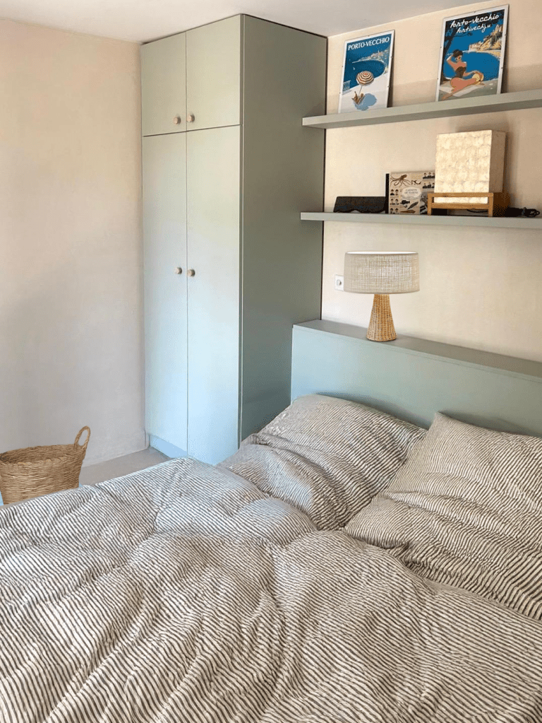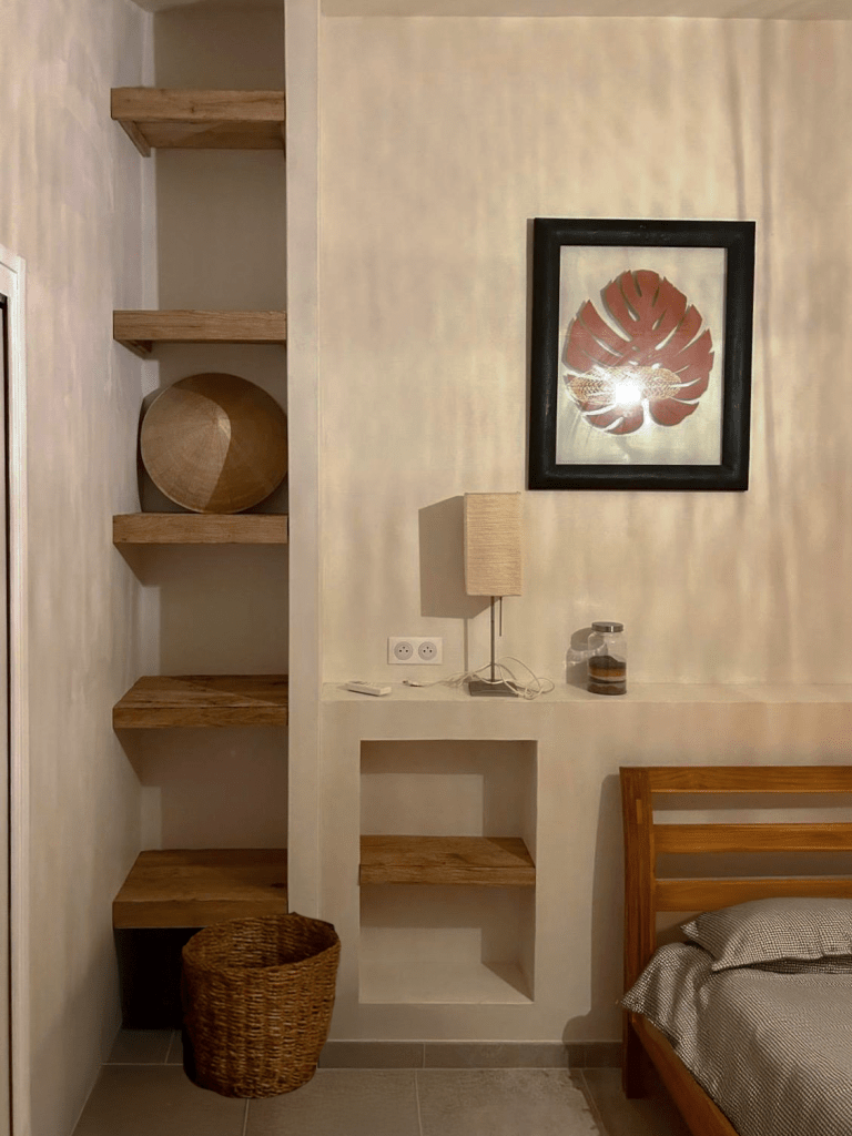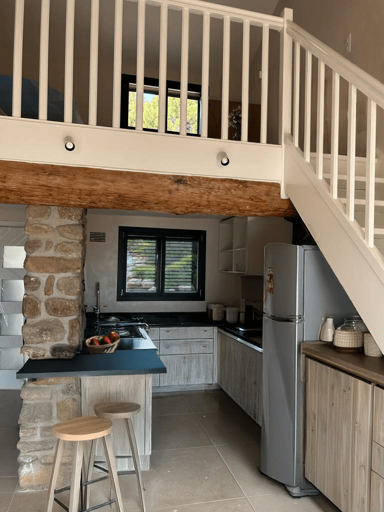 À l’étage, les matériaux naturels sont à l’honneur dans la mezzanine, les deux chambres et la salle de bain. Le jonc de mer au sol, les murs à la chaux, les niches maçonnées et les éléments de mobilier en bois brut créent une atmosphère authentique et apaisante, en parfaite harmonie avec l’esprit du lieu. Une restructuration légère de l’escalier a permis d’améliorer sa fluidité et son ergonomie, renforçant le confort général de la maison.