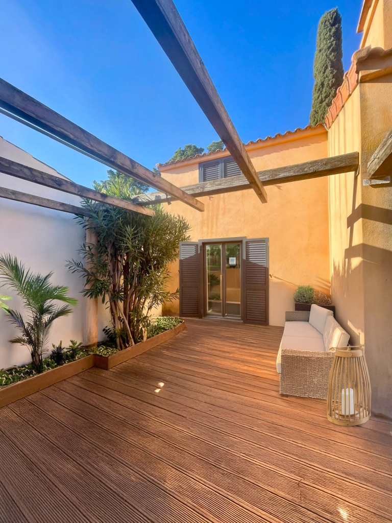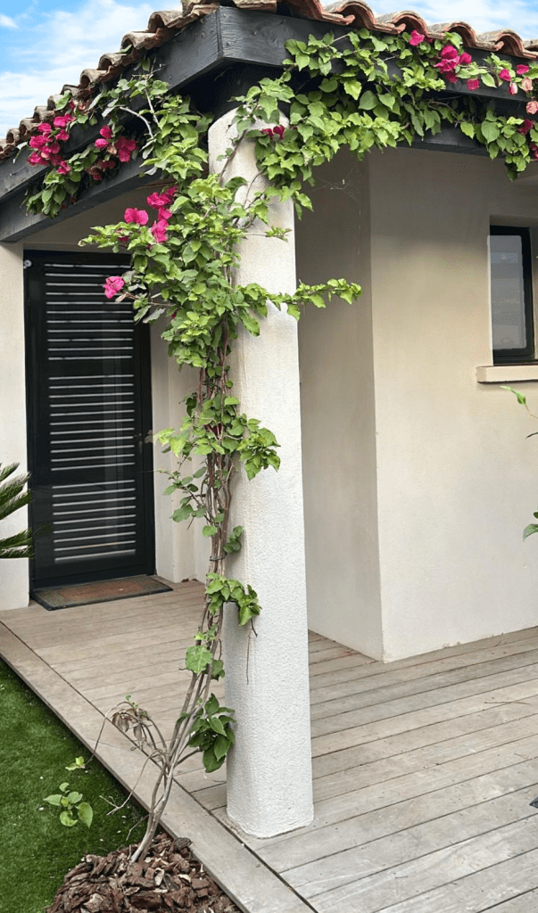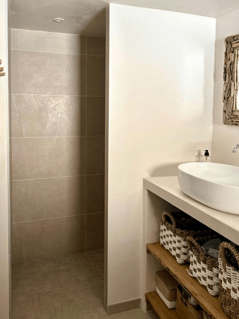 À l’extérieur, un ravalement soigné s’accompagne de l’aménagement d’un patio accueillant et de la création d’une terrasse avec piscine, qui descend progressivement vers la mer, offrant une transition douce entre la maison et le paysage maritime. Une douche extérieure a été intégrée pour profiter pleinement de la vie en plein air.