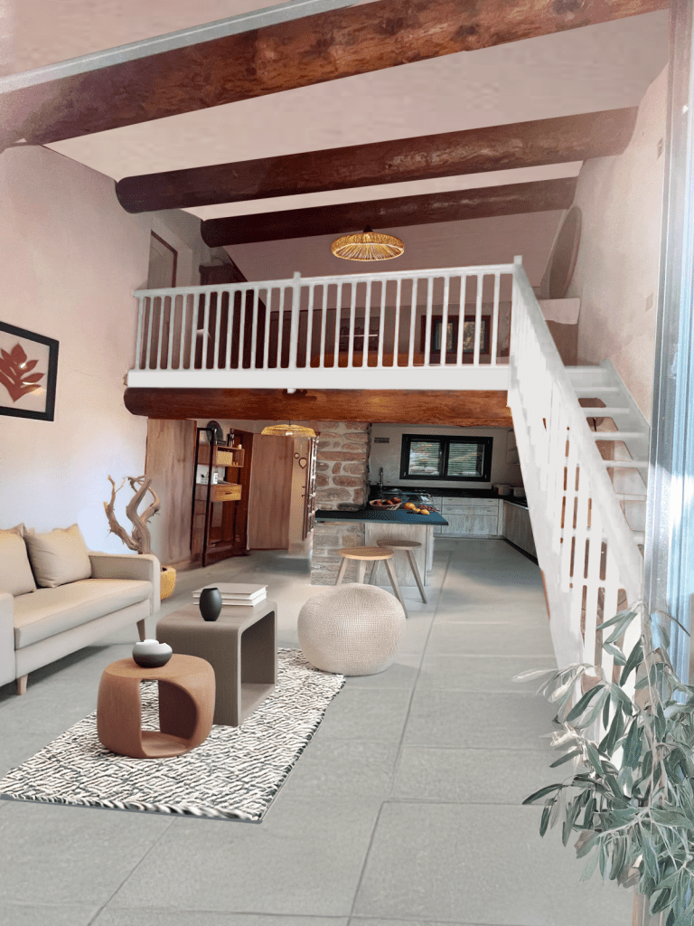 À l’intérieur, le rez-de-chaussée a été entièrement réaménagé. Le patio et l’accès à la maison ont été repensés, tandis que la cuisine s’ouvre désormais sur le séjour pour créer un espace lumineux et convivial. La chambre et la salle de bain ont également été réorganisées pour plus de confort. Les poutres ont été sablées, et les plafonds ainsi que les rampants blanchis, tandis que les murs recouverts de chaux diffusent une lumière douce et naturelle dans toute la maison.