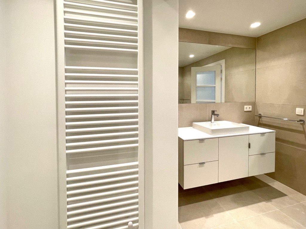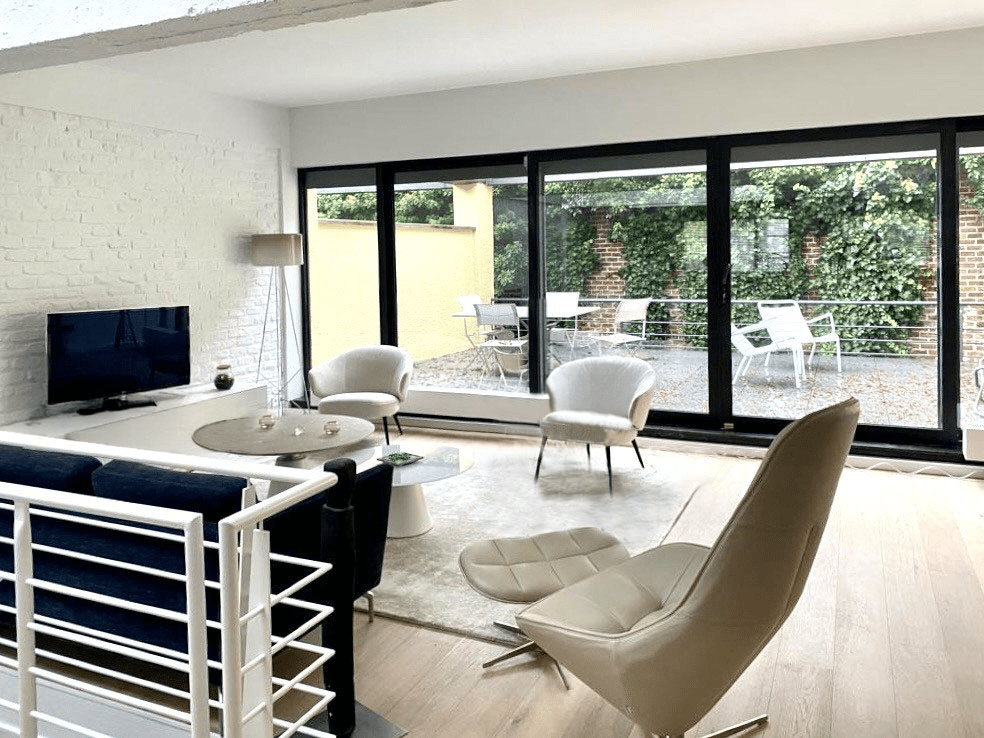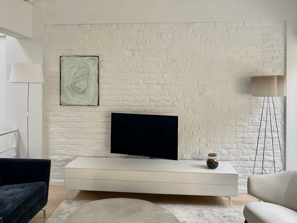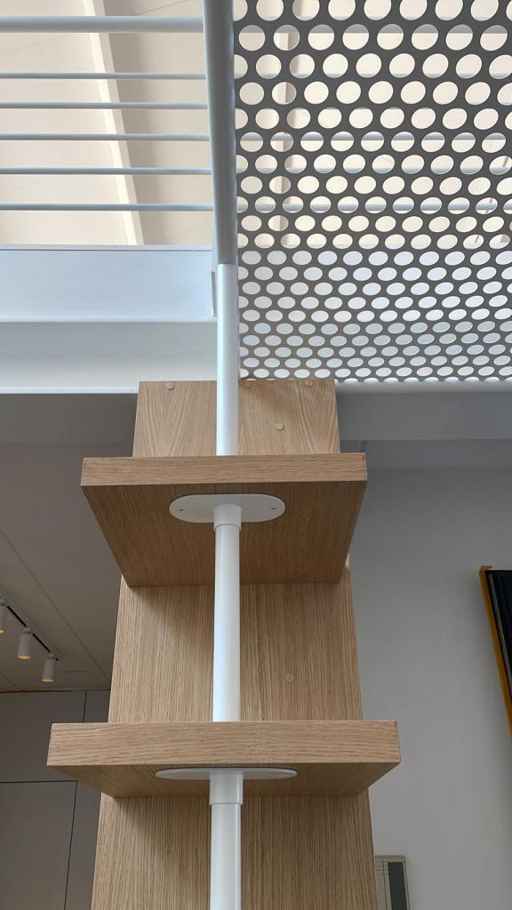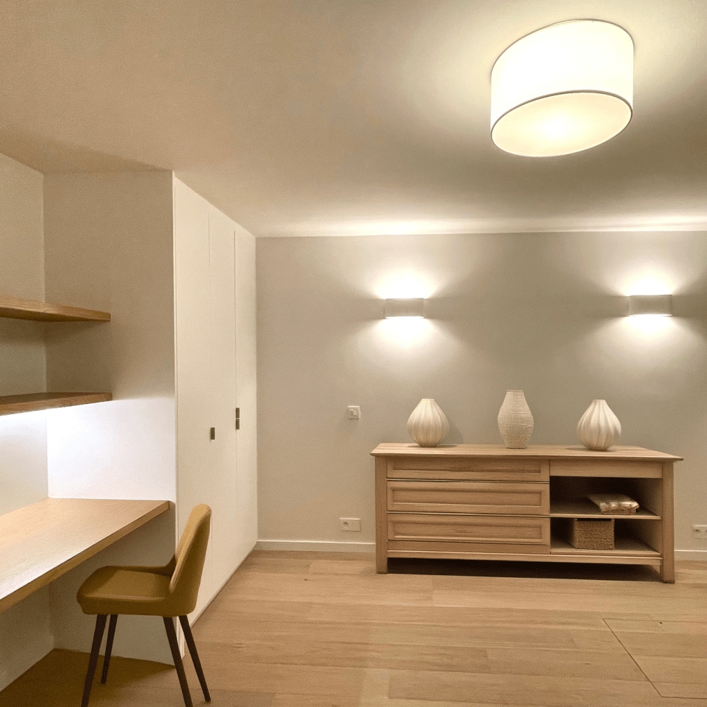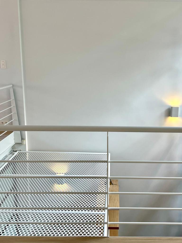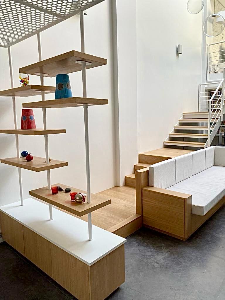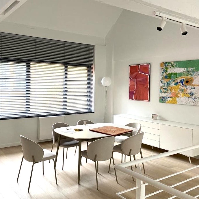 Projet : Réaménagement d’un loft lumineux à Bruxelles pour un collectionneur d’art. Conception d’espaces distincts sans cloisonnement complet, grâce à l’utilisation de tôle perforée, permettant de diviser les zones tout en laissant passer la lumière. L’utilisation du chêne apporte une touche de chaleur, tandis que les surfaces blanches mettent en valeur les œuvres d’art dans une scénographie sobre et subtile, où chaque espace laisse entrevoir le suivant.